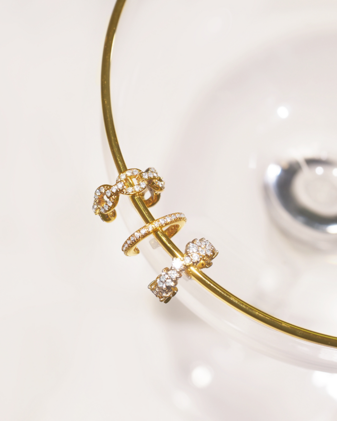 A striking blend of crystal shine and delicate chains, this ear cuff adds movement and drama to any curated ear stack.