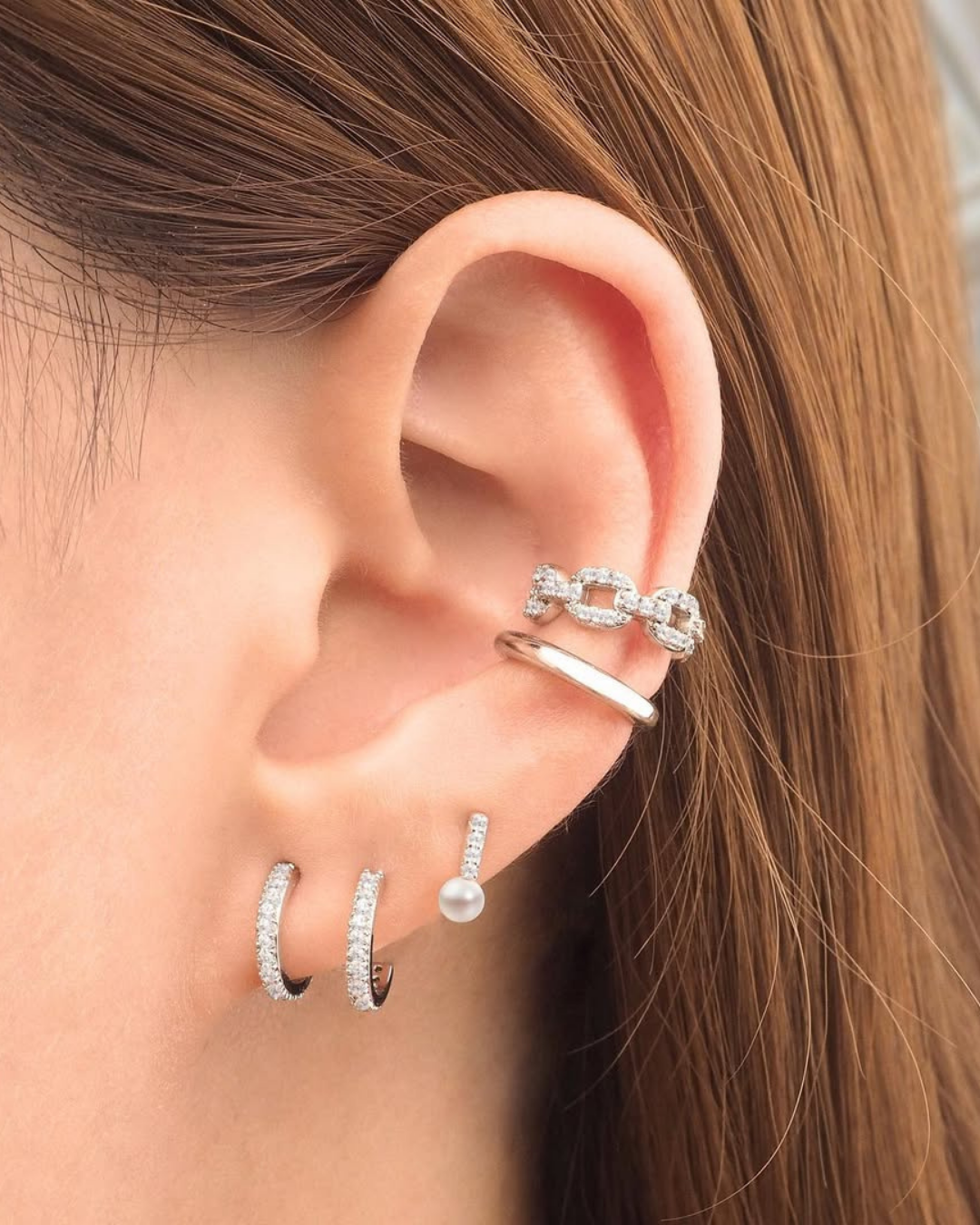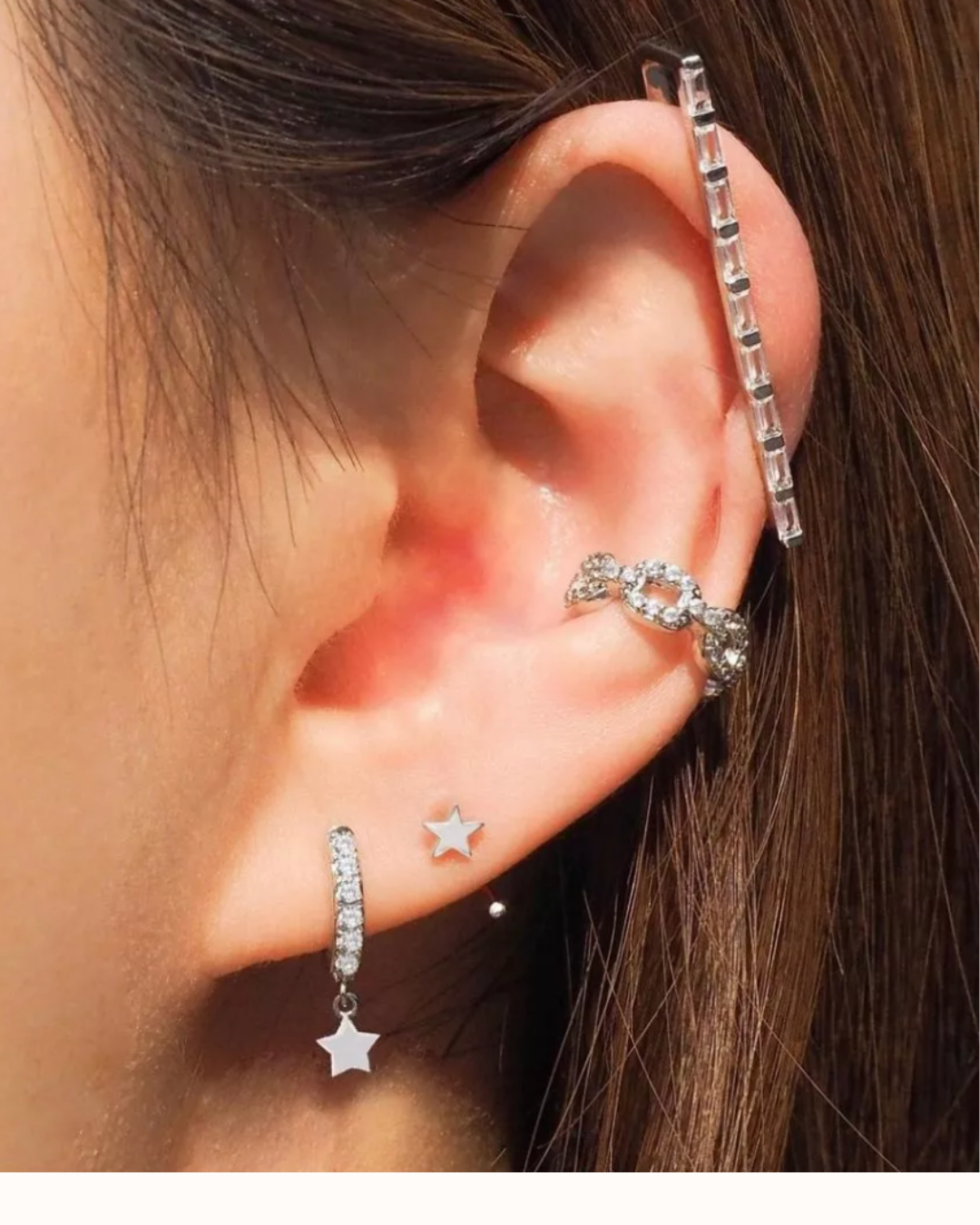 A striking blend of crystal shine and delicate chains, this ear cuff adds movement and drama to any curated ear stack.