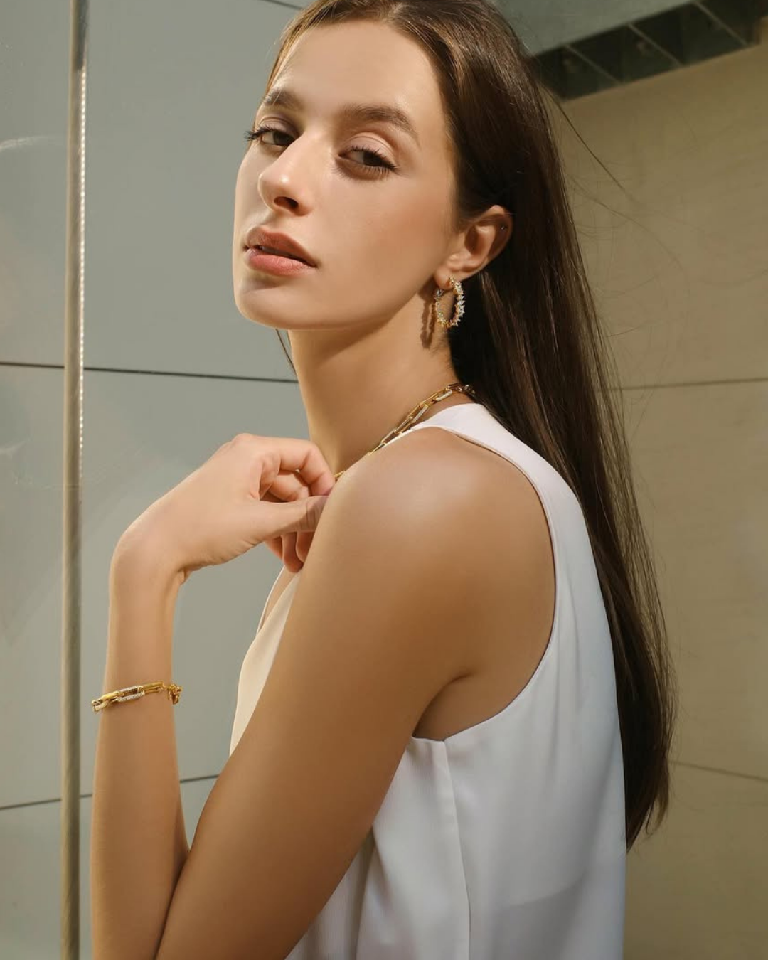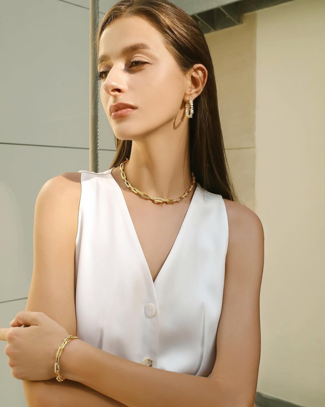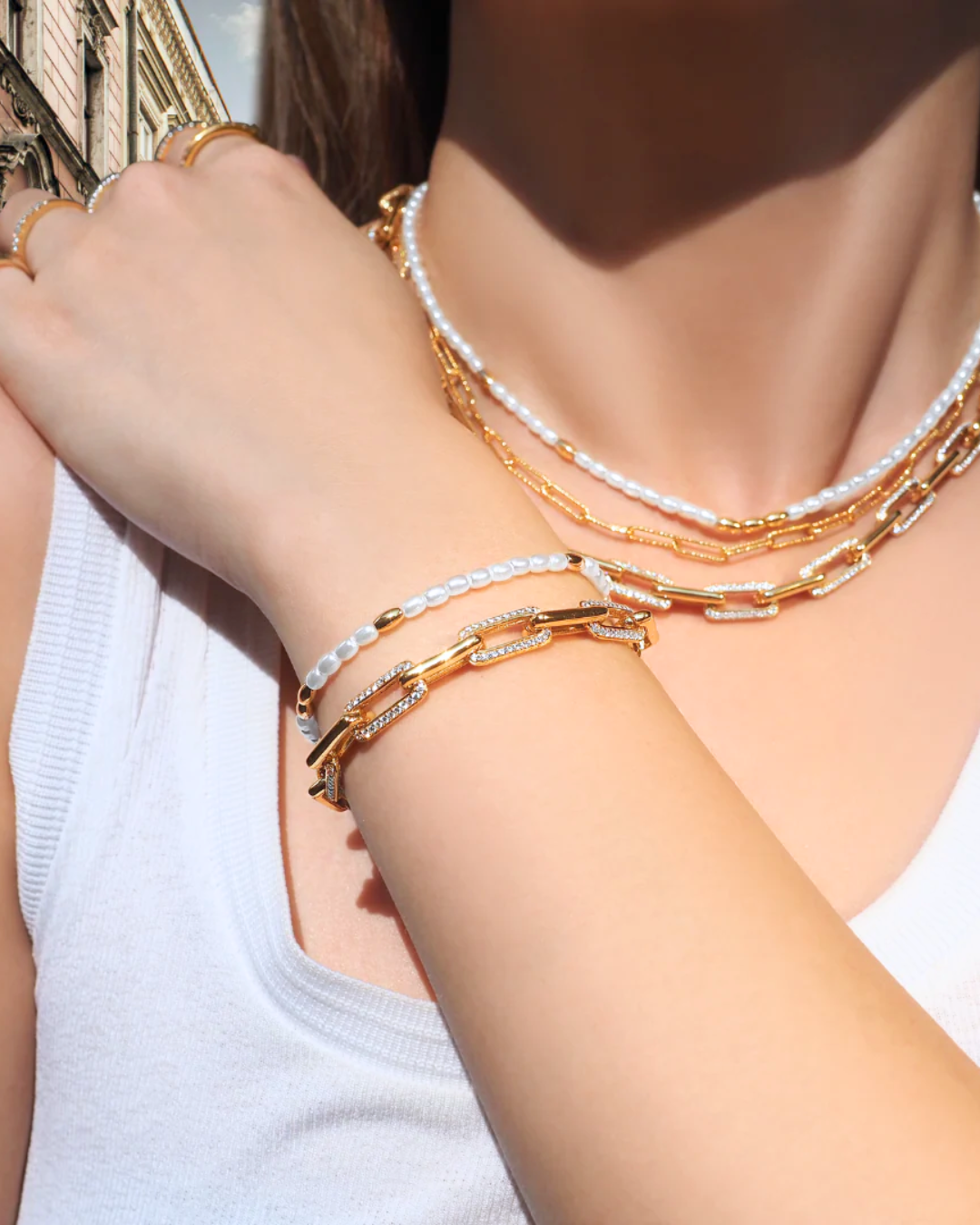 Modern and bold, this bracelet adds dimension with chunky links and crystal touches. An eye-catching style that still feels wearable every day.