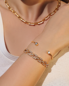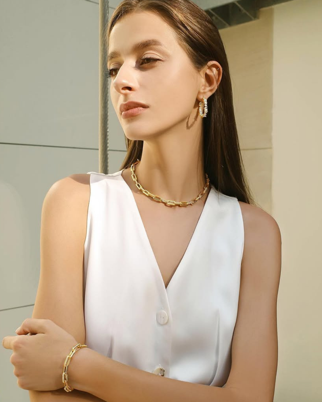 The Luxe Kourtney Choker features a statement chain with bold crystal accents, offering both edge and elegance. Its refined finish makes it suitable for both casual and night-out looks.