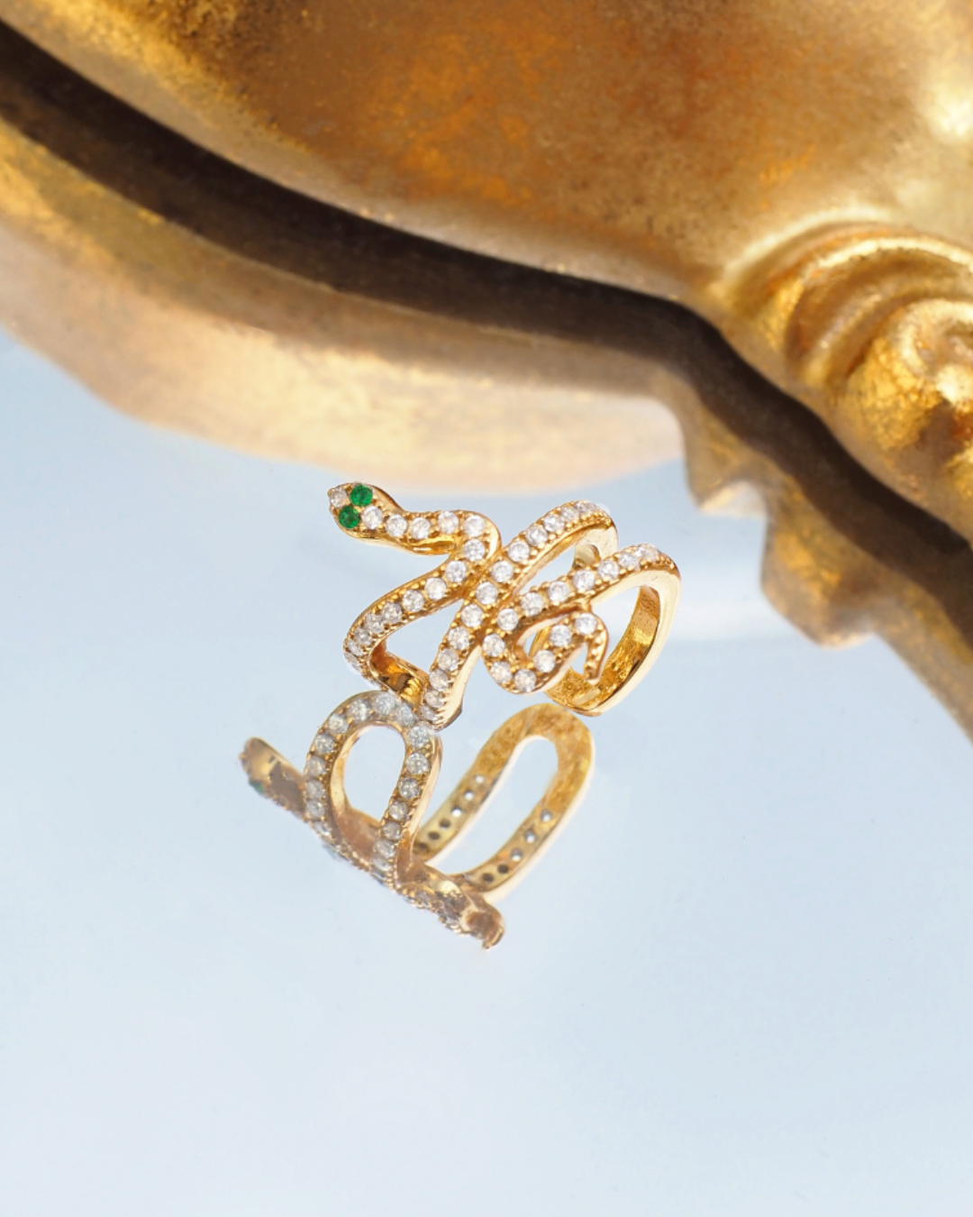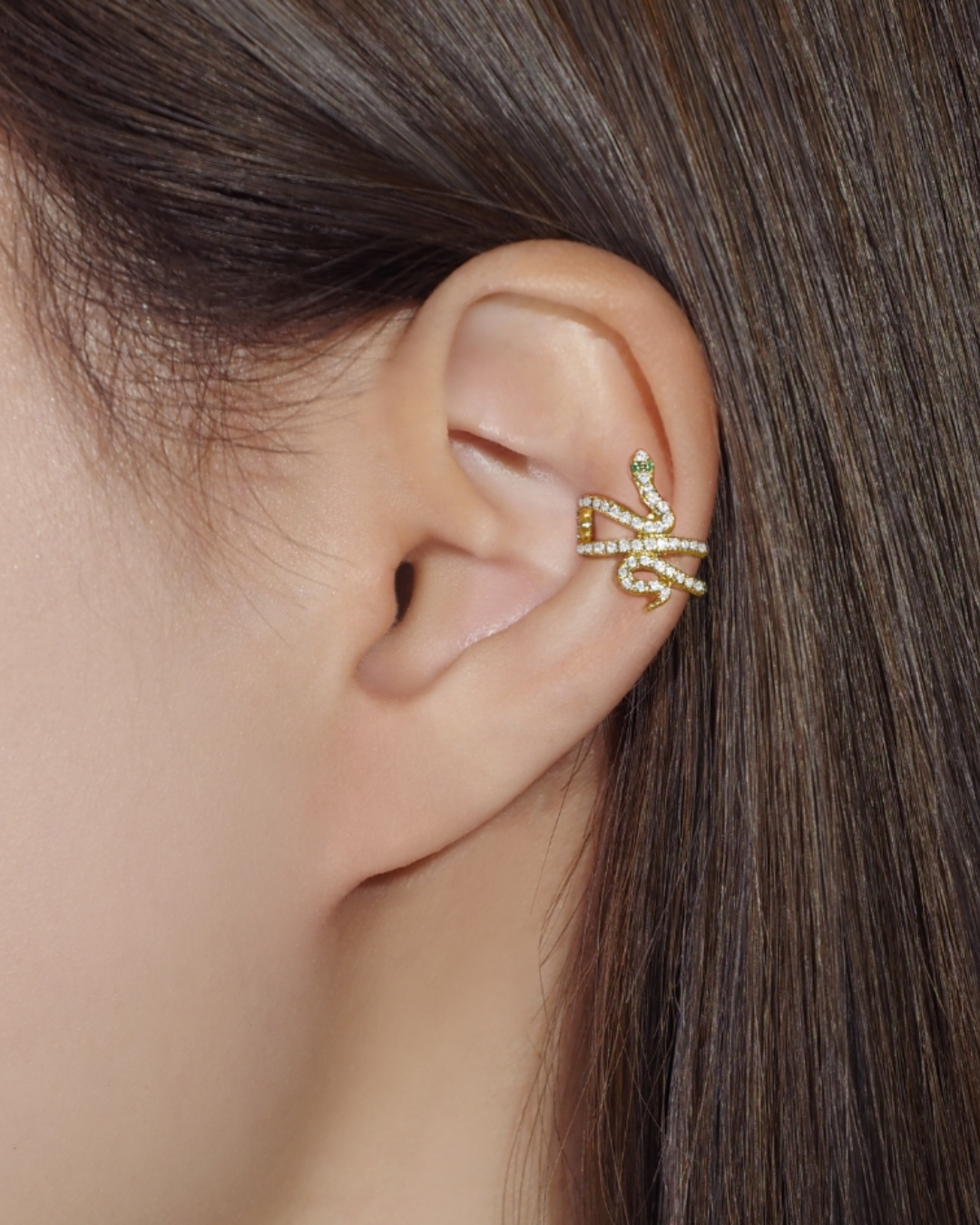 Inspired by ancient serpents, this statement cuff coils your ear in a crystal embrace that’s both fierce and refined.