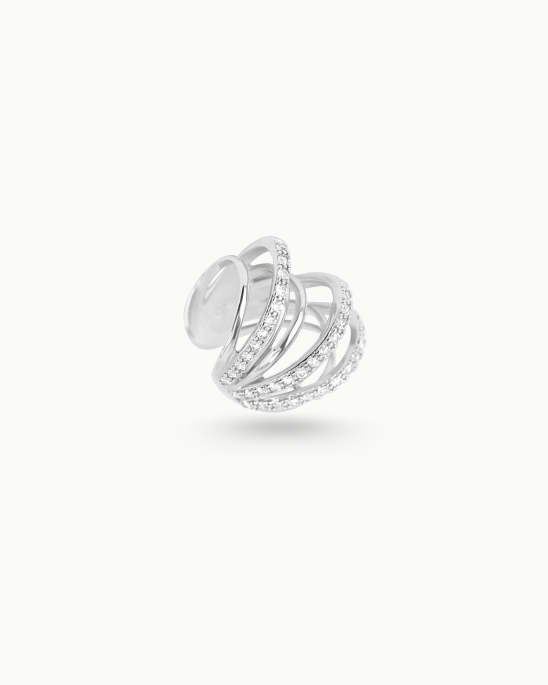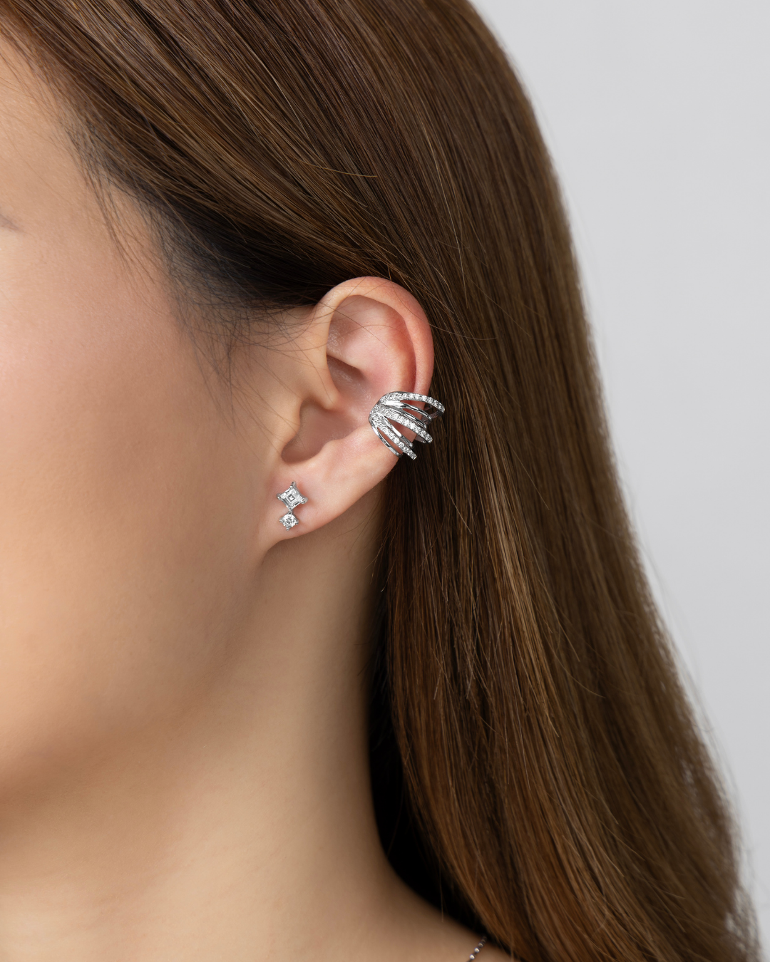 A curvy silhouette lined with light-catching stones that hugs your ear with a radiant, fluid elegance.