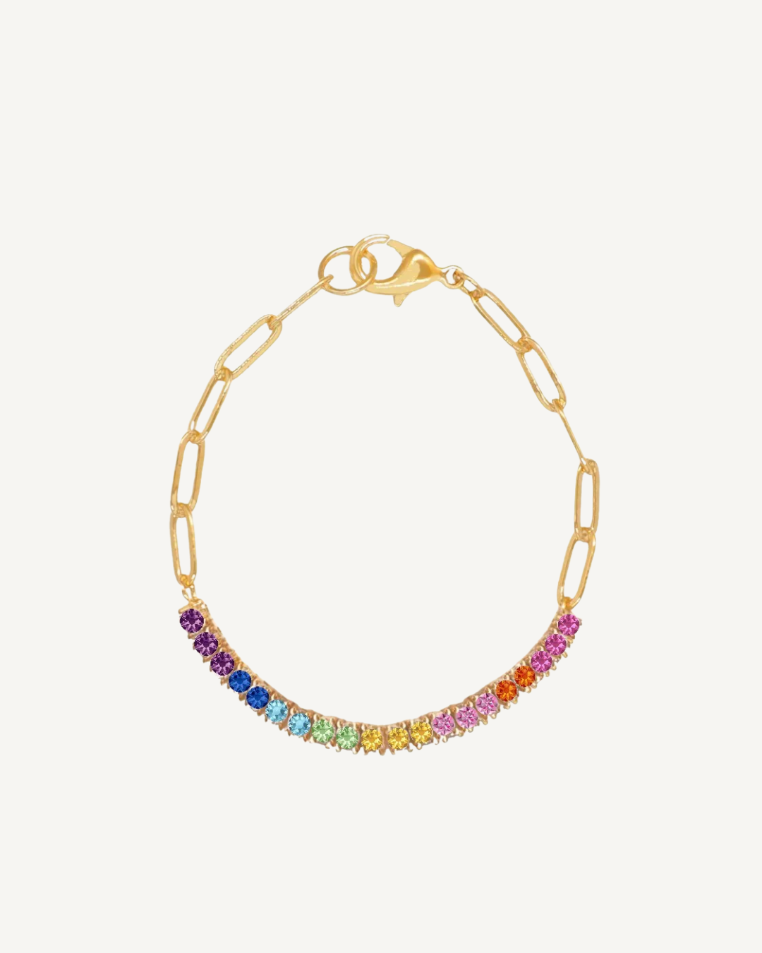 Celebrate color with this playful crystal bracelet featuring a soft rainbow gradient. Each crystal is carefully set to reflect a spectrum of joy and individuality.