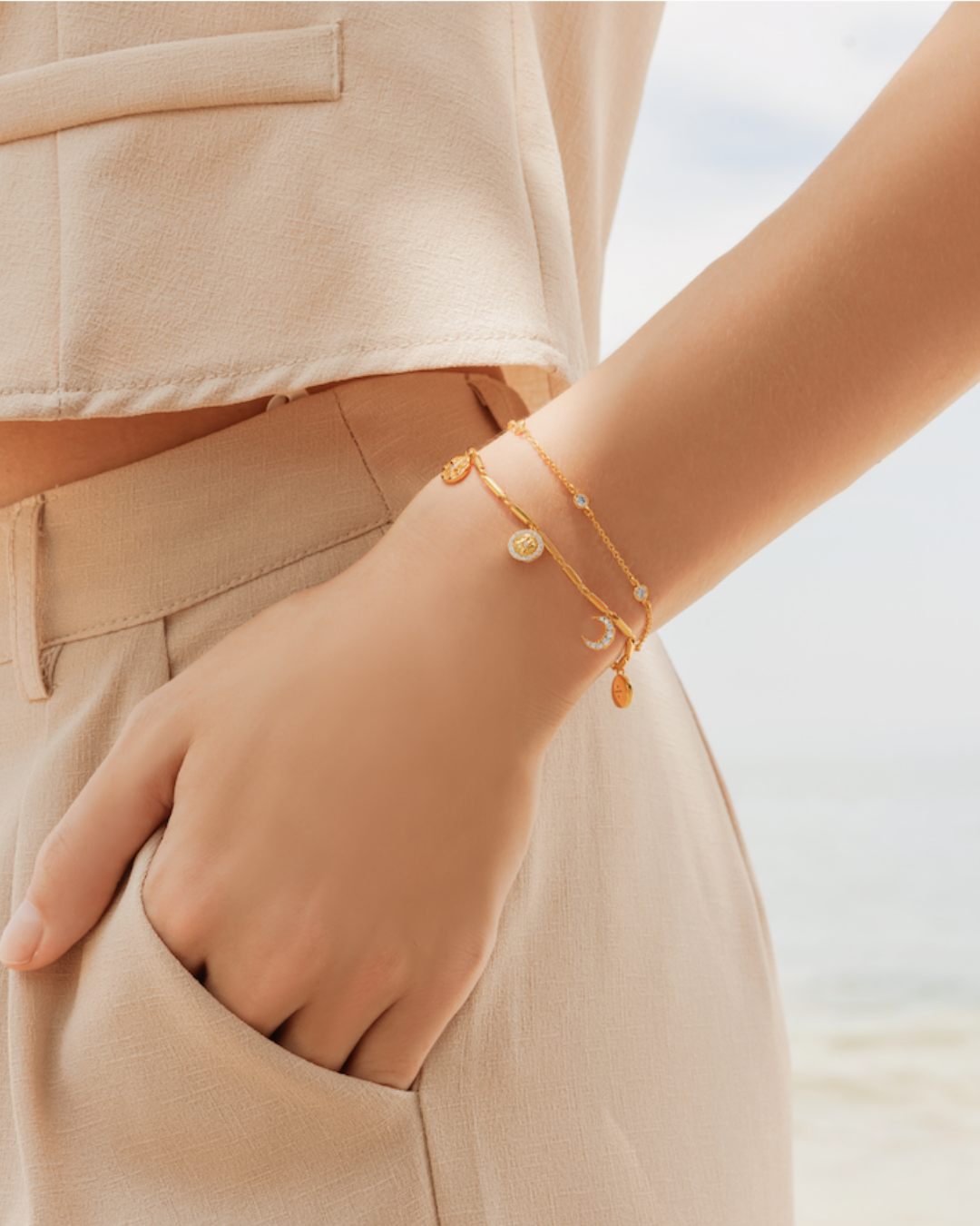 This bracelet brings the magic of the galaxy to your wrist with a mix of shimmering crystal accents and celestial-inspired charm details. Each piece is delicately placed to create a balanced, cosmic-inspired look.