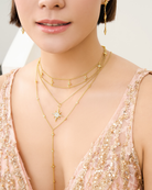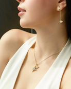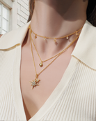 Radiate your inner brilliance with this exquisite necklace, featuring twin starburst charms adorned with shimmering crystals. Crafted thoughtfully to inspire confidence, each charm symbolizes the beauty of your dreams and aspirations.